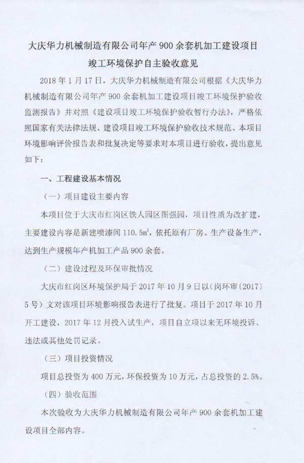 大慶華力機(jī)械制造有限公司年產(chǎn)900余套機(jī)加工建設(shè)項目自主驗收公示